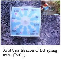 Paper-based analytical devices (PADs) have recently attracted a great deal of interest due to a simple structure, easy fabrication, lightness of weight, inexpensive materials, and rapid analysis. Our aim is to achieve real on-site analysis, that is, to develop the PADs which actually work in the field. We have developed PADs for acid-base titration (1), chelate titration (2), determination of iron ion (3,4), and determination of chromium ion (5).