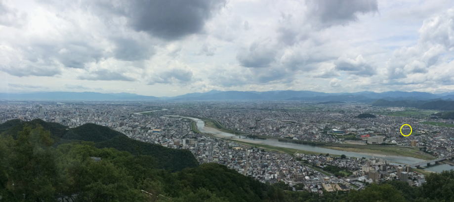 岐阜市金華山山頂付近から撮影した写真です。写真右側の丸印をしたところが会場です。